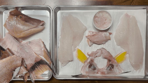 Use our Fish Recipes Database to find recipe for the Hogfish “off cuts.” These “off cuts” include but aren’t limited to; the collars, ribs, head, skin, blood line and the fish frame. You can also do more with the internal organs of the fish, but I don’t have much experience with that yet. While there are plenty of resources out there that demonstrate how to fillet a hogfish, I haven’t come across many that really show how to break one down. The video above will be the best way to follow this break down process, but I have also included a how to guide below as well.